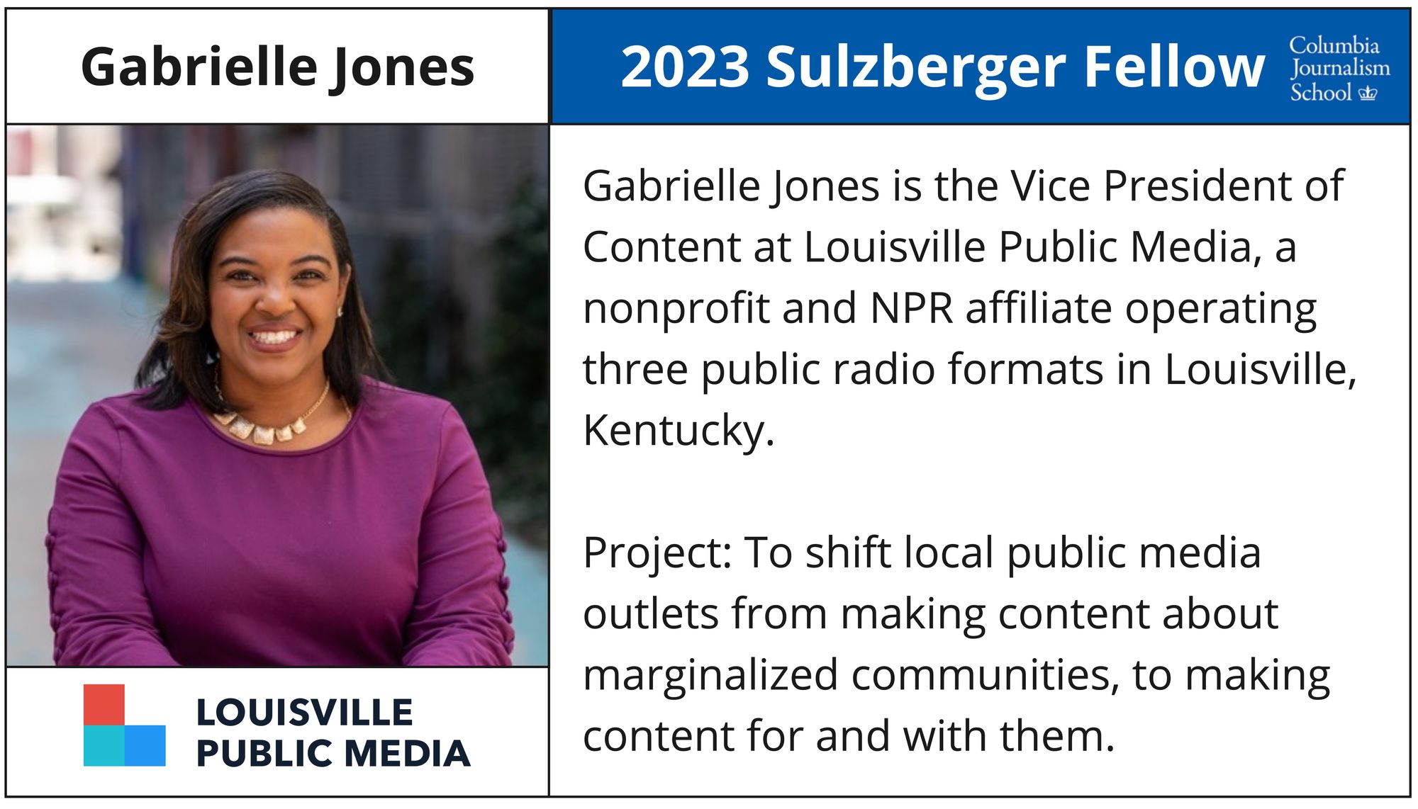 - Gabrielle Jones - Vice President of Content, Louisville Public Media (Google News Initiative Scholarship)
