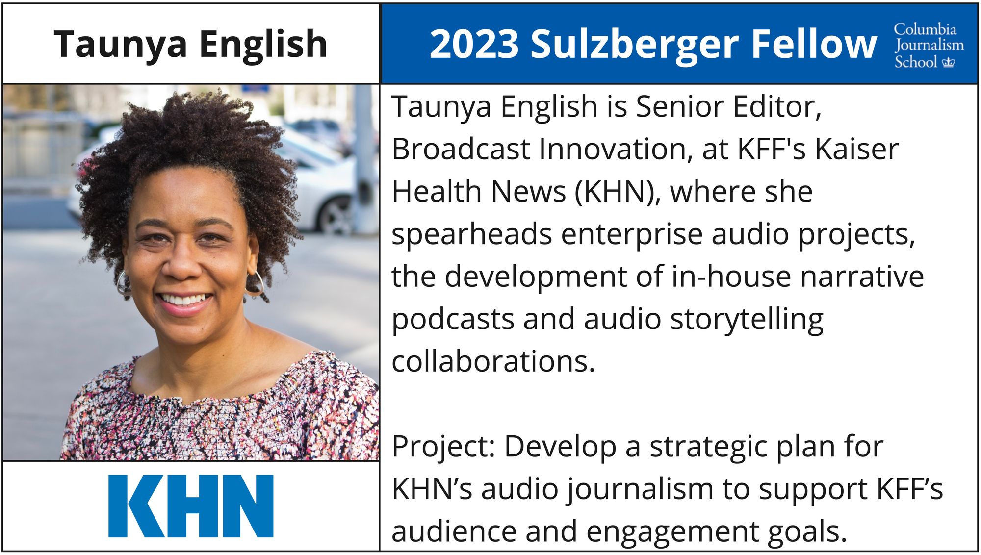 - Taunya English - Senior Editor, Broadcast Innovation, KHN (Google News Initiative Scholarship)
