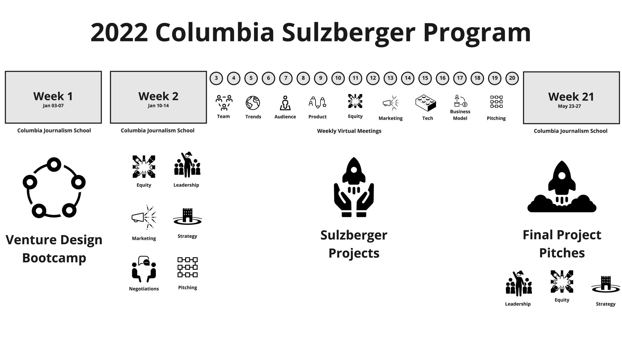 The Sulzberger program trains leaders of the world’s most respected news organizations and promising media start-ups to lead innovation and solve strategic business challenges in a time of rapid transformation, uncertainty, and opportunity. Fellows use the 21-week program to launch, accelerate, and implement a real-world project that is critical to the mission of their organizations and integrated into their day-to-day work. The program will begin with a two-week residency on the campus of Columbia Journalism School in New York City January 03-14, 2022 and conclude with one final week of residency, May 23-27, 2022, with weekly virtual cohort sessions in between. Sulzberger Fellows will also have regular one-on-one executive coaching sessions with me.