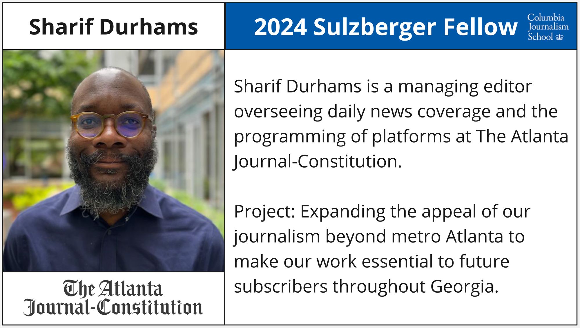 - Sharif Durhams - Managing Editor - News & Programming, The Atlanta Journal-Constitution (Google News Initiative Scholarship)